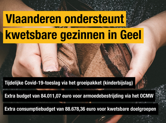 De Vlaamse Regering werkte drie concrete maatregelen uit om naar aanleiding van de COVID-19-pandemie kwetsbare huishoudens extra te ondersteunen. Ook op Geel hebben deze maatregelen een positieve impact.