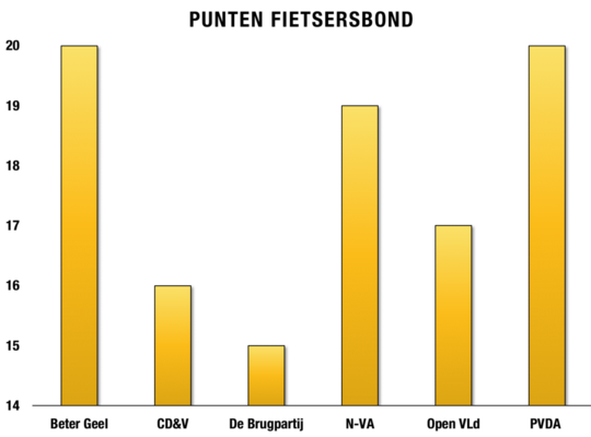 Het enige punt dat wij als partij niet onderschrijven is de vraag om 10% van het totale investeringsbudget te spenderen aan fietsbeleid. Op basis van de huidige precaire toestand van de stadskas is het onmogelijk om ons tot dat te verbinden. Echter, we blijven bereid om forse investeringen te doen in een betere fietsinfrastructuur. Zo blijft onze partij vasthouden dat bij grote infrastructuurwerken ook de positie van de zwakke weggebruikers en specifiek de fietser in rekening moet gebracht worden. Bovendien, gaat het bovenlokale niveau fietsinfrastructuur nog meer subsidiëren en zullen we in een volgende legislatuur (als wij deel uitmaken van het bestuur) deze subsidies ook maximaal benutten om fietsbruggen en -tunnels aan te leggen. Zo zal binnenkort het eerste voorbeeld van zo een bovenlokale inspanning zichtbaar zijn in Geel met de aanleg van de fiets-o-strade en de daaraan verbonden ondertunneling van de ring ter hoogte van Rauwelkoven.